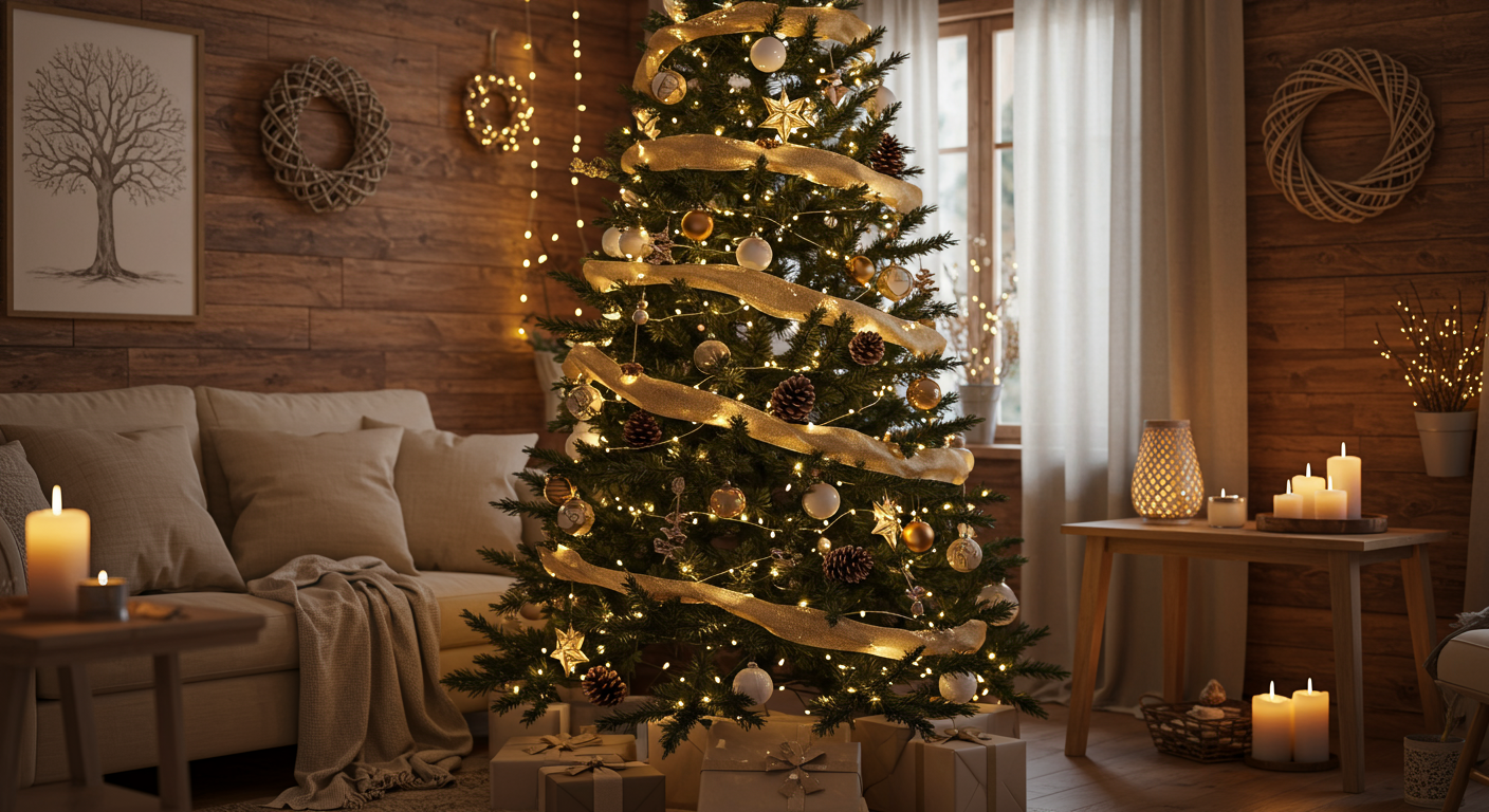 Instead of traditional ornaments, consider decorating with natural elements like pinecones, dried oranges, and wooden ornaments for an earthy, Montana-inspired look. A tree trimmed with burlap ribbon and a few classic glass baubles in neutral colors brings a refined, understated elegance to your holiday decor.