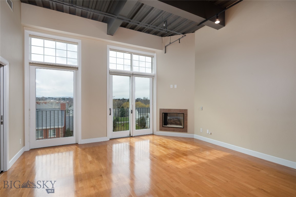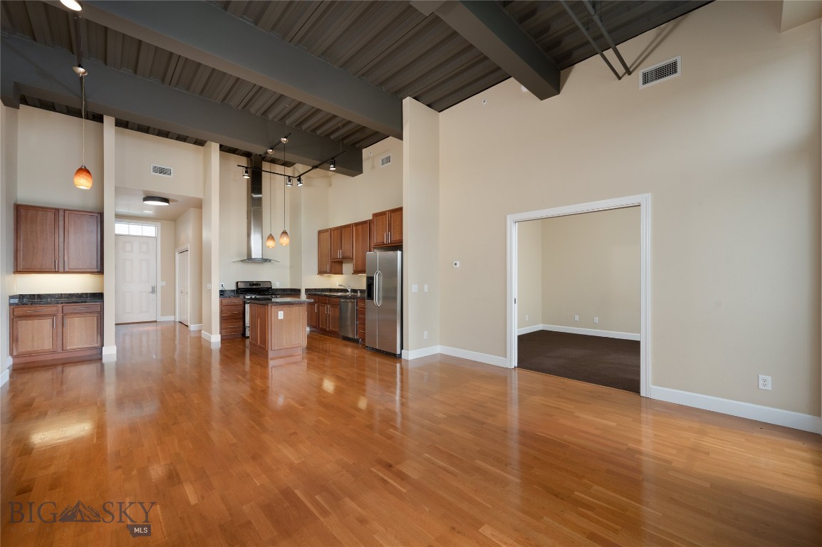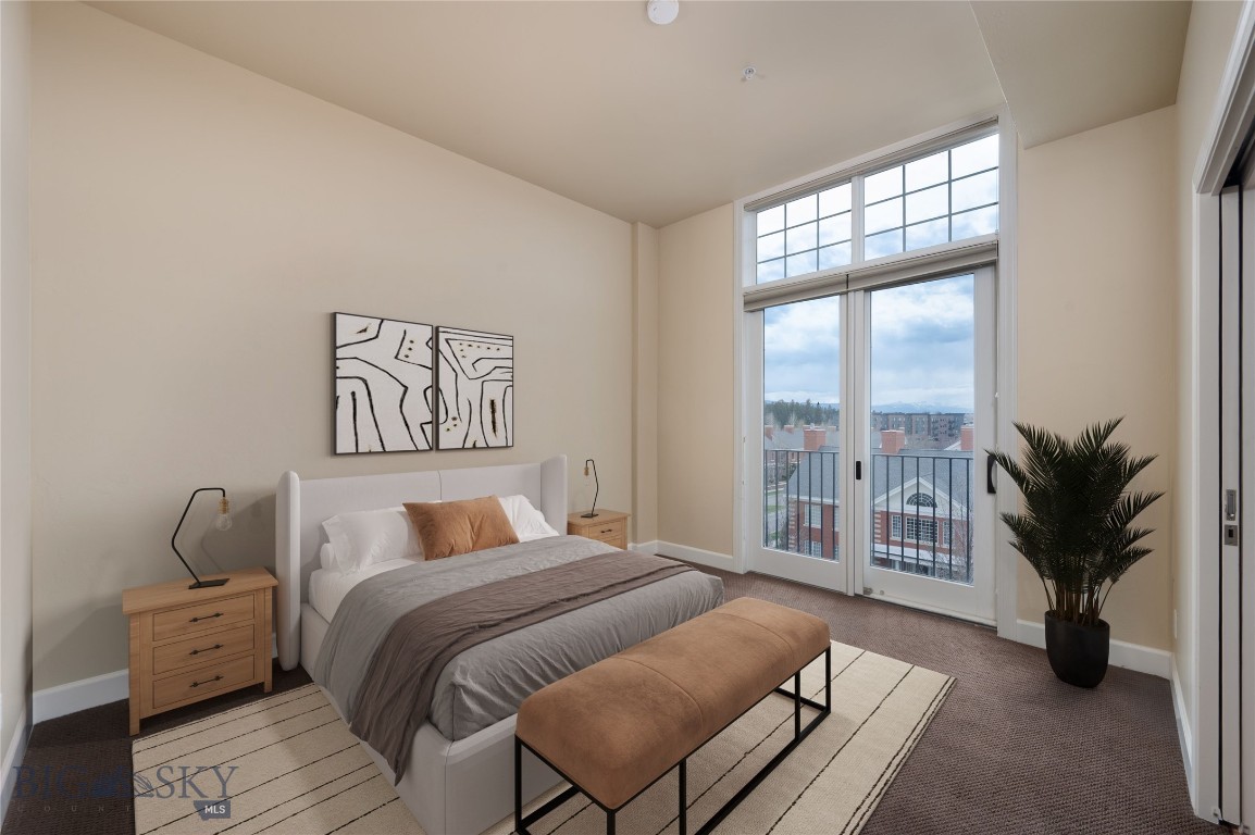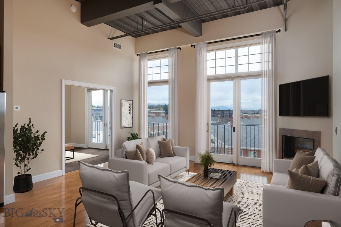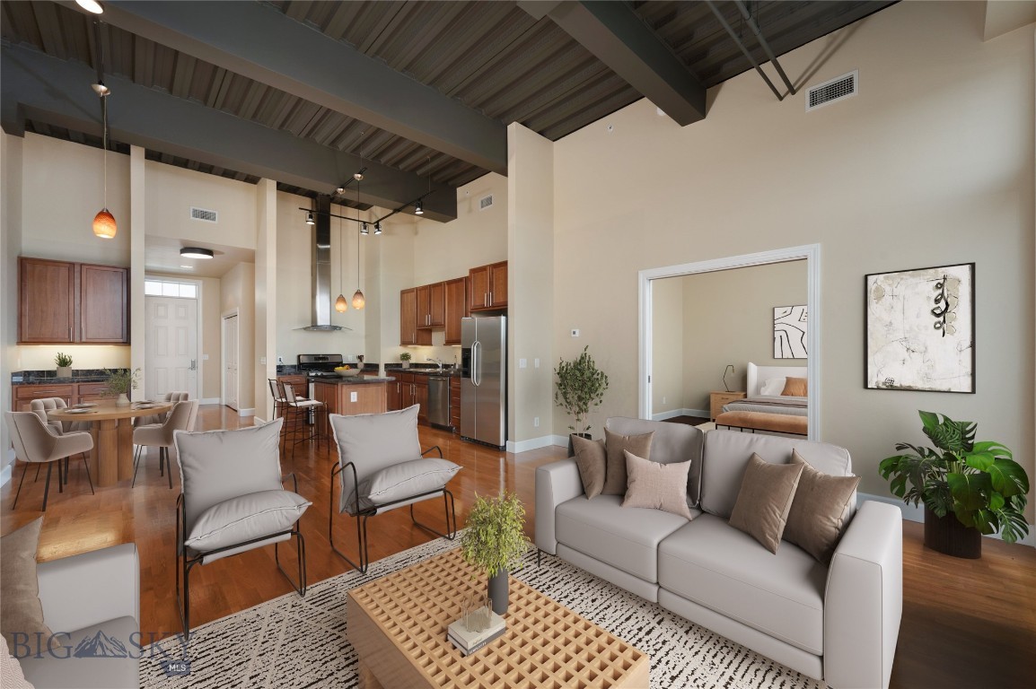 Perched on the fourth floor of Village Downtown, this beautifully appointed residence offers something increasingly rare in the heart of the city -- space, stillness, and a view worth coming home to. Step out your door and you're steps from Main Street's best restaurants, boutiques, and cultural energy. Step back inside, and the world quiets down. The moment you enter, the drama of soaring vaulted ceilings sets this residence apart from anything else downtown Bozeman has to offer. This is not a typical urban condo -- it feels open, airy, and genuinely grand, with a sense of volume that you simply have to experience in person. Expansive windows amplify that feeling, flooding the space with natural light and drawing your eye outward to the southwest, where two private balconettes open via sliding glass doors to sweeping views across the rooftops toward Big Sky and the Spanish Peaks. Unlike many downtown residences, this home sits on the serene side of Village Downtown -- with little noise, and interruptions -- just open skies, mountain views, and the kind of stillness that's hard to come by this close to Main Street. Whether you're catching the alpenglow on an evening glass of wine or simply leaving the doors open to let the mountain air move through, these are the moments that define life at this address. As the city lights come alive below, the living spaces become some of the best seats in town. The open-concept layout flows naturally between living, dining, and kitchen beneath those remarkable ceilings, finished with the kind of thoughtful detail that makes a space feel genuinely livable -- not just impressive on paper. The kitchen is built for both weeknight ease and weekend entertaining, while the primary suite offers a true retreat: spa-inspired bath, dual vanities, soaking tub, and an enclosed shower. A well-separated guest bedroom and full bath ensure visitors have their own comfortable corner of the world. This is a lock-and-leave lifestyle done right -- dedicated underground parking, effortless access to I-90 and Bozeman Yellowstone International Airport, and Bozeman Health Deaconess Hospital just minutes away. Whether you're in town full-time or treating this as your Montana basecamp, Village Downtown delivers the convenience of Bozeman's downtown amenities with the soul of the mountains just outside your window.