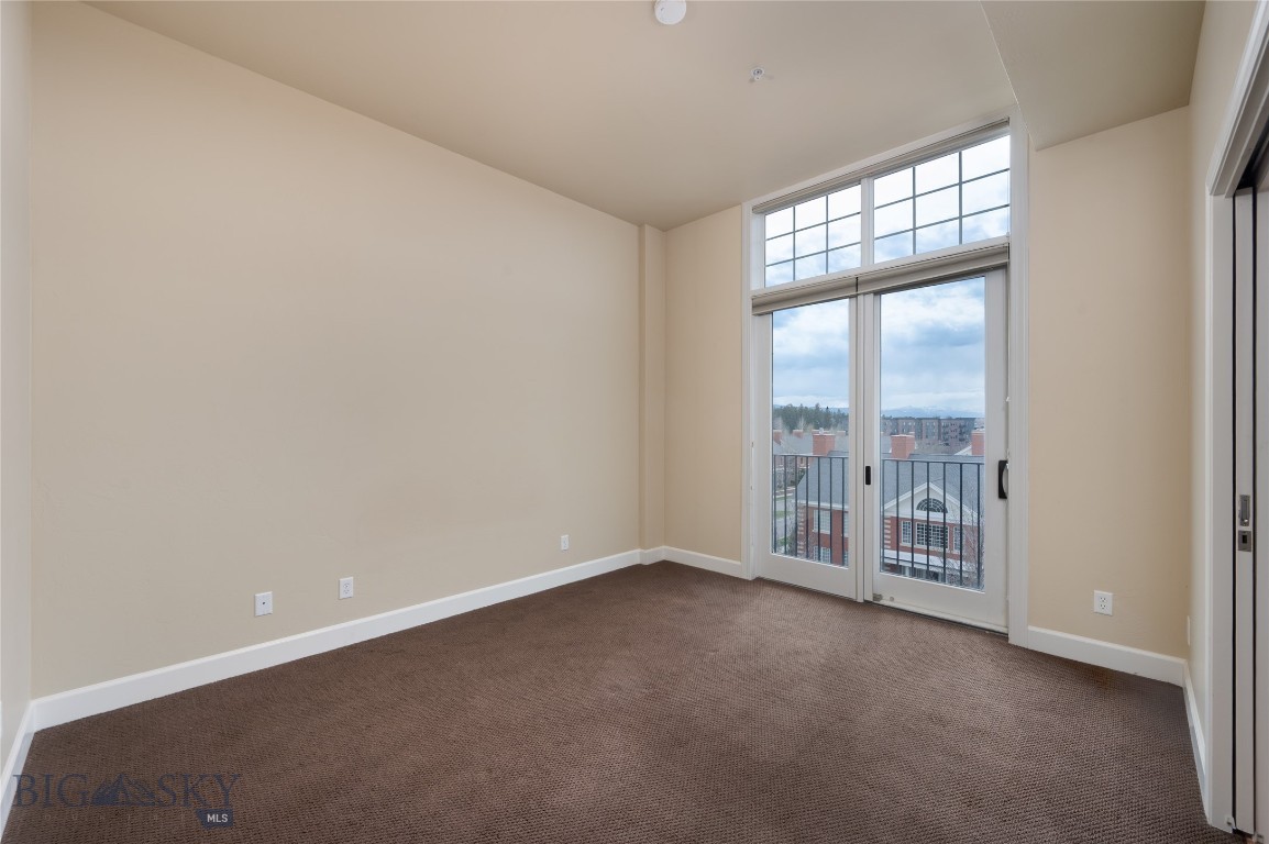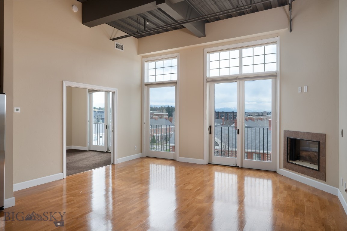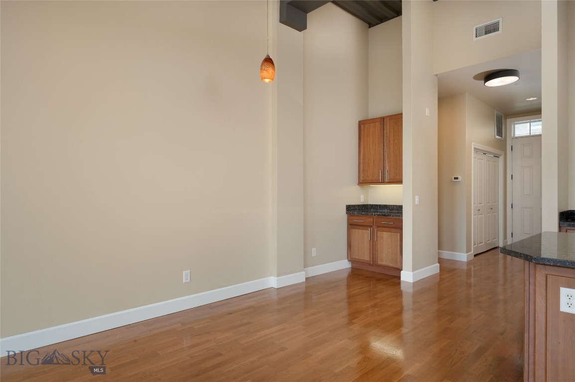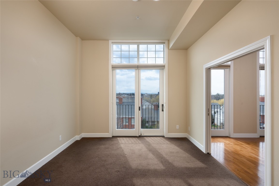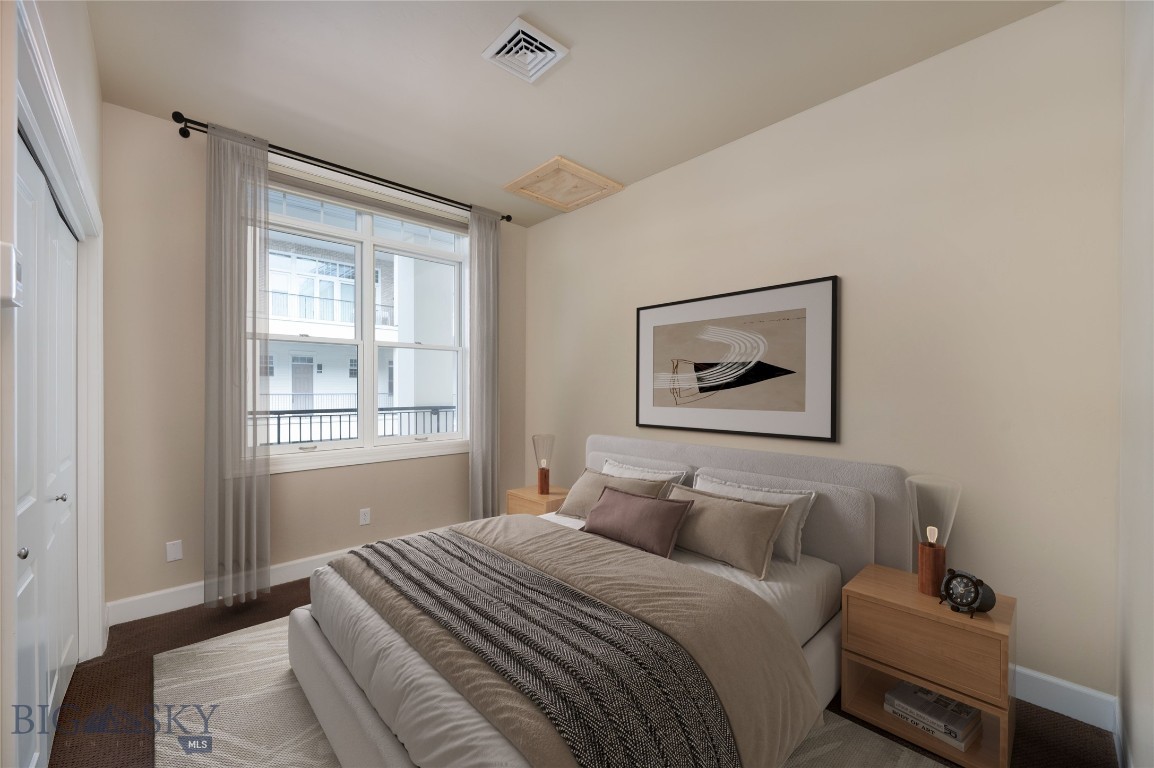 Perched on the fourth floor of Village Downtown, this beautifully appointed residence offers something increasingly rare in the heart of the city -- space, stillness, and a view worth coming home to. Step out your door and you're steps from Main Street's best restaurants, boutiques, and cultural energy. Step back inside, and the world quiets down. The moment you enter, the drama of soaring vaulted ceilings sets this residence apart from anything else downtown Bozeman has to offer. This is not a typical urban condo -- it feels open, airy, and genuinely grand, with a sense of volume that you simply have to experience in person. Expansive windows amplify that feeling, flooding the space with natural light and drawing your eye outward to the southwest, where two private balconettes open via sliding glass doors to sweeping views across the rooftops toward Big Sky and the Spanish Peaks. Unlike many downtown residences, this home sits on the serene side of Village Downtown -- with little noise, and interruptions -- just open skies, mountain views, and the kind of stillness that's hard to come by this close to Main Street. Whether you're catching the alpenglow on an evening glass of wine or simply leaving the doors open to let the mountain air move through, these are the moments that define life at this address. As the city lights come alive below, the living spaces become some of the best seats in town. The open-concept layout flows naturally between living, dining, and kitchen beneath those remarkable ceilings, finished with the kind of thoughtful detail that makes a space feel genuinely livable -- not just impressive on paper. The kitchen is built for both weeknight ease and weekend entertaining, while the primary suite offers a true retreat: spa-inspired bath, dual vanities, soaking tub, and an enclosed shower. A well-separated guest bedroom and full bath ensure visitors have their own comfortable corner of the world. This is a lock-and-leave lifestyle done right -- dedicated underground parking, effortless access to I-90 and Bozeman Yellowstone International Airport, and Bozeman Health Deaconess Hospital just minutes away. Whether you're in town full-time or treating this as your Montana basecamp, Village Downtown delivers the convenience of Bozeman's downtown amenities with the soul of the mountains just outside your window.