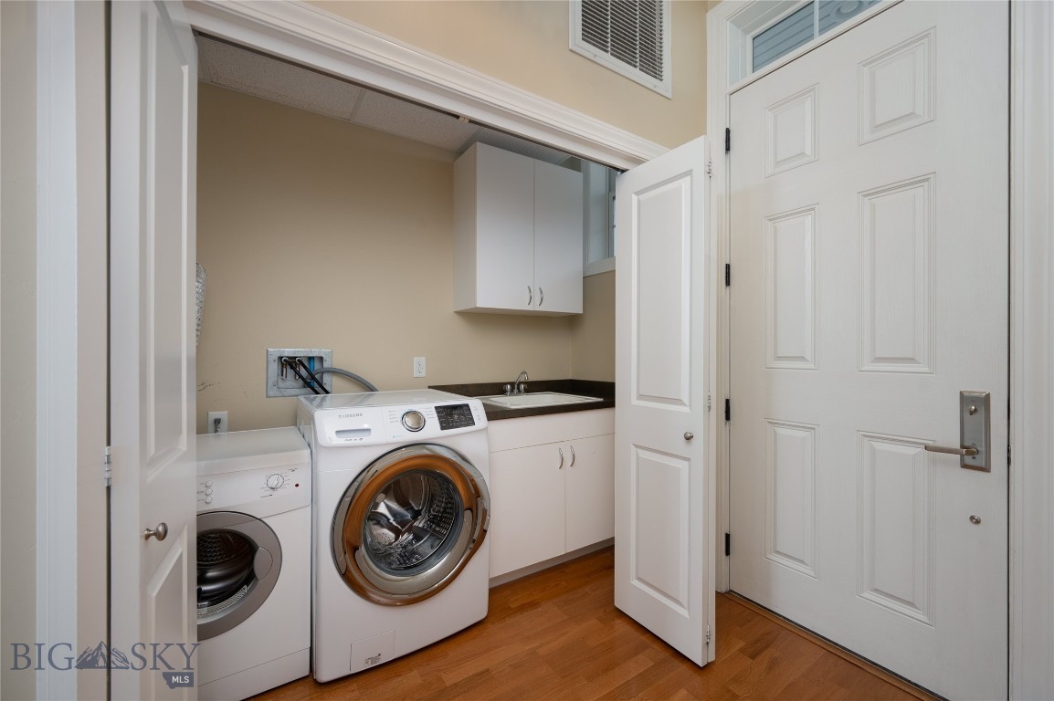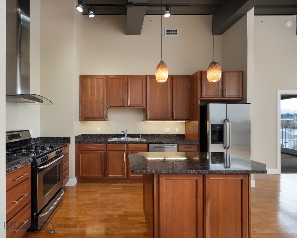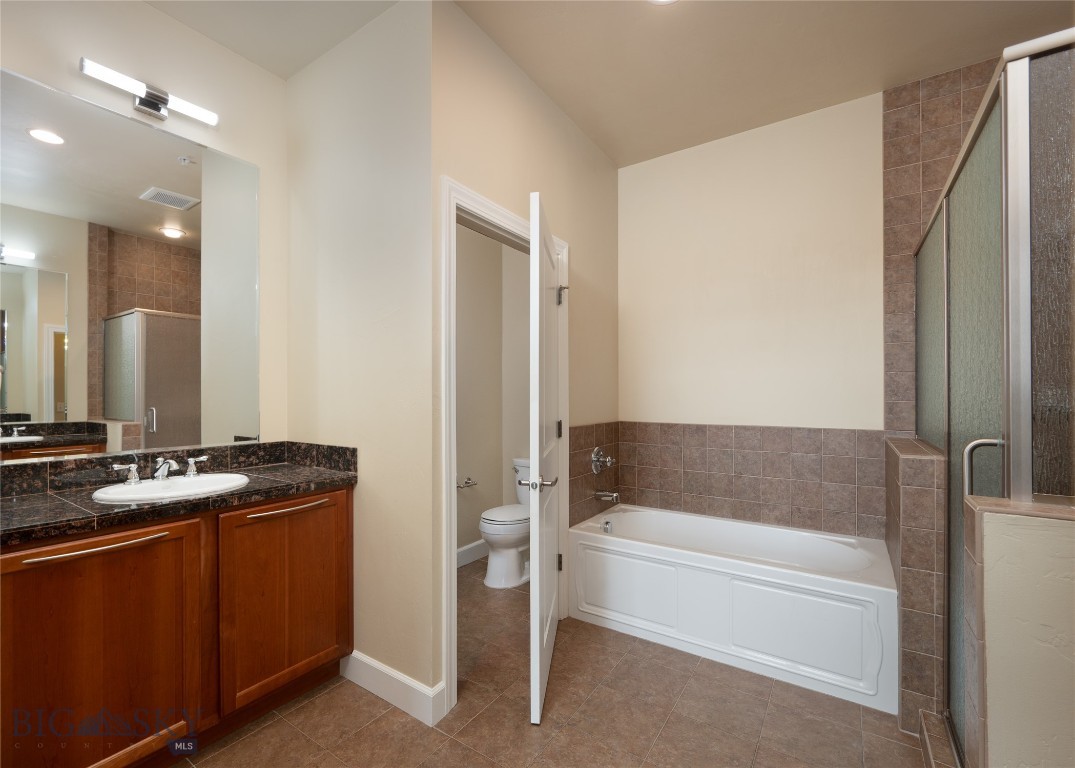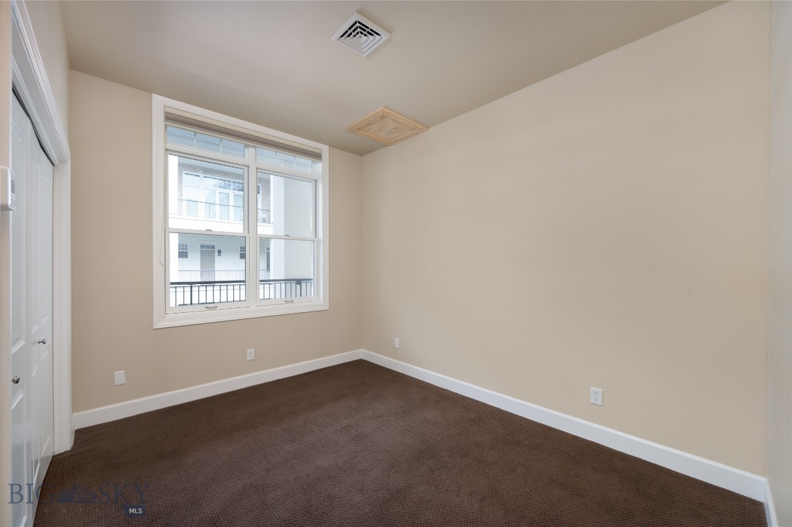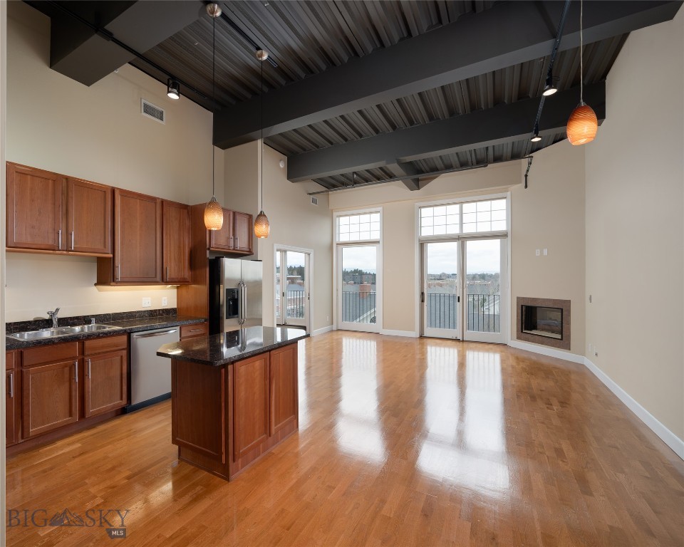 Perched on the fourth floor of Village Downtown, this beautifully appointed residence offers something increasingly rare in the heart of the city -- space, stillness, and a view worth coming home to. Step out your door and you're steps from Main Street's best restaurants, boutiques, and cultural energy. Step back inside, and the world quiets down. The moment you enter, the drama of soaring vaulted ceilings sets this residence apart from anything else downtown Bozeman has to offer. This is not a typical urban condo -- it feels open, airy, and genuinely grand, with a sense of volume that you simply have to experience in person. Expansive windows amplify that feeling, flooding the space with natural light and drawing your eye outward to the southwest, where two private balconettes open via sliding glass doors to sweeping views across the rooftops toward Big Sky and the Spanish Peaks. Unlike many downtown residences, this home sits on the serene side of Village Downtown -- with little noise, and interruptions -- just open skies, mountain views, and the kind of stillness that's hard to come by this close to Main Street. Whether you're catching the alpenglow on an evening glass of wine or simply leaving the doors open to let the mountain air move through, these are the moments that define life at this address. As the city lights come alive below, the living spaces become some of the best seats in town. The open-concept layout flows naturally between living, dining, and kitchen beneath those remarkable ceilings, finished with the kind of thoughtful detail that makes a space feel genuinely livable -- not just impressive on paper. The kitchen is built for both weeknight ease and weekend entertaining, while the primary suite offers a true retreat: spa-inspired bath, dual vanities, soaking tub, and an enclosed shower. A well-separated guest bedroom and full bath ensure visitors have their own comfortable corner of the world. This is a lock-and-leave lifestyle done right -- dedicated underground parking, effortless access to I-90 and Bozeman Yellowstone International Airport, and Bozeman Health Deaconess Hospital just minutes away. Whether you're in town full-time or treating this as your Montana basecamp, Village Downtown delivers the convenience of Bozeman's downtown amenities with the soul of the mountains just outside your window.