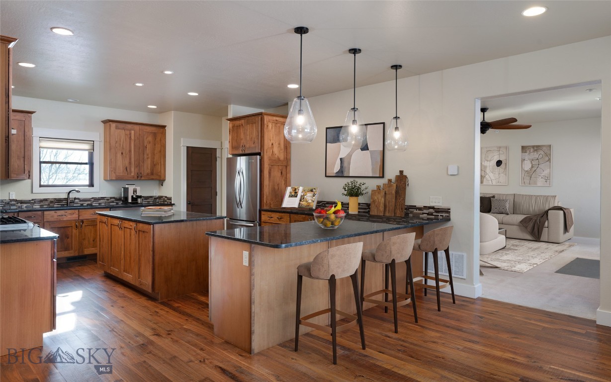 Welcome to 45 Spain Bridge Circle Drive, where expansive space, privacy, and panoramic Montana views define everyday living. Situated on 1.81 serene acres and bordered by protected open land, this rare property offers the feeling of a private retreat--yet remains just minutes from Bozeman, Belgrade, and the airport. This is Montana living at its finest: wide-open surroundings, generous living spaces, and uninterrupted mountain vistas. With over 4,100 square feet of thoughtfully designed living space, the home is crafted for comfort, flexibility, and effortless main-level living. The open-concept kitchen features abundant counter space, stainless steel appliances, and seamless flow into the dining and living areas--ideal for entertaining, gathering with family and friends, or relaxing by the wood burning fireplace. The main level includes four spacious bedrooms and three well-appointed bathrooms, providing exceptional convenience and room for family and guests on a single floor. The fully finished lower level expands your living options with a large bonus room, a fifth bedroom, a newly finished bathroom, extensive storage, and a massive workshop with direct driveway access--perfect for hobbies, home projects, or a home-based business. High-speed fiber internet supports remote work and modern connectivity. Step outside to experience what truly sets this property apart: sweeping 360-degree views from the Bridger Mountains to vibrant Montana vistas. A fenced backyard and underground dog fence add functionality, while the oversized three-car garage, central air conditioning, water softener, and abundant storage ensure year-round comfort and convenience. Enjoy privacy and space without sacrificing access to Bozeman's downtown amenities, restaurants, shopping, Montana State University, Belgrade's charm, and endless outdoor recreation. At 45 Spain Bridge Circle Drive, you are not just purchasing a home--you are securing your own spacious and serene Montana retreat.
